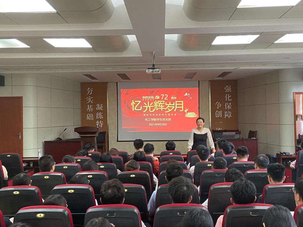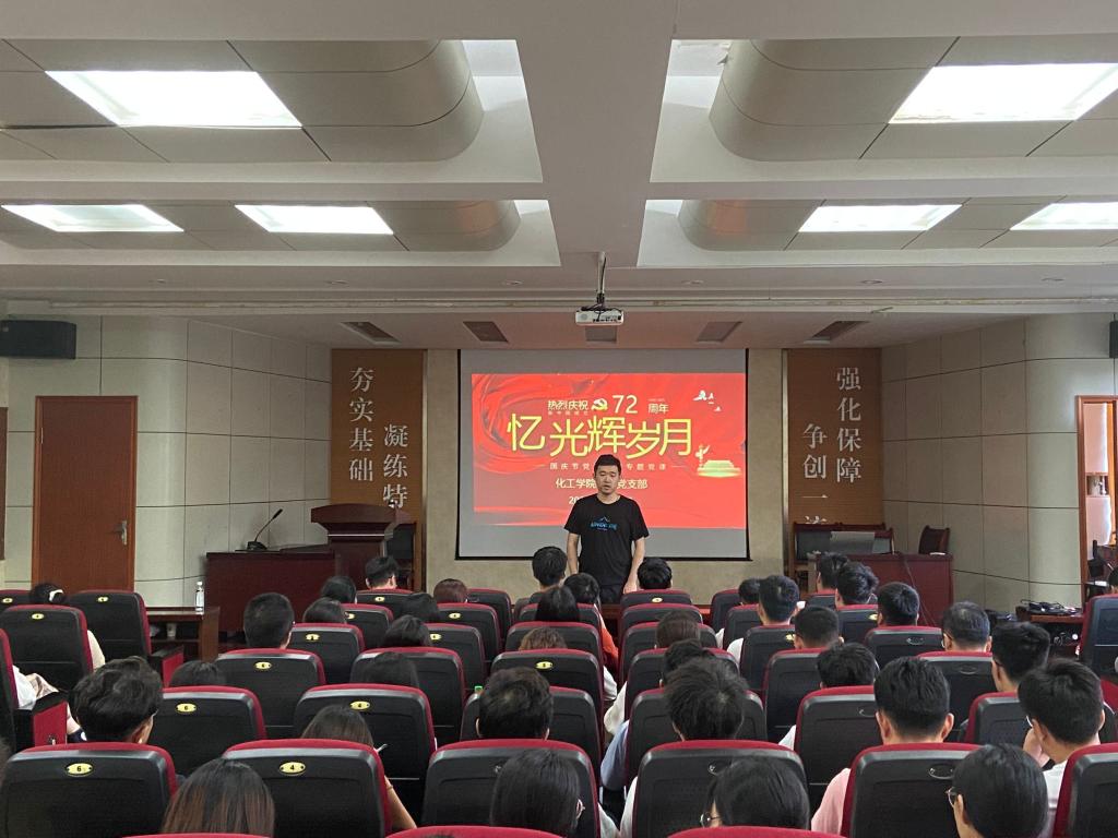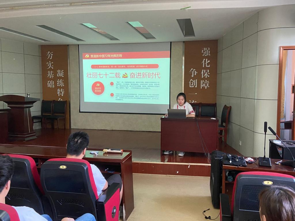 学生党员齐琳同学为在场党员讲述新中国成立以来的历史进程。她以开国大典的视频资料为切入点,讲述了国庆节对当今社会的重要意义,回顾中华人民共和国成立以来72年的光辉历程,历代共产党人在将中国建设成为社会主义现代化强国历程中付出了不懈的奋斗与努力。她分四个部分讲述了新中国在经济、政治、民生等方面取得的伟大成就,进而指出学好党史国史有助于认清国情,有助于坚定社会主义信念,有助于加强党的建设。她鼓励党员们要以时不我待的精神,如饥似渴学、对照结合学、联系实际学,不断强化专业素养储备,努力做起而行之的行动者。