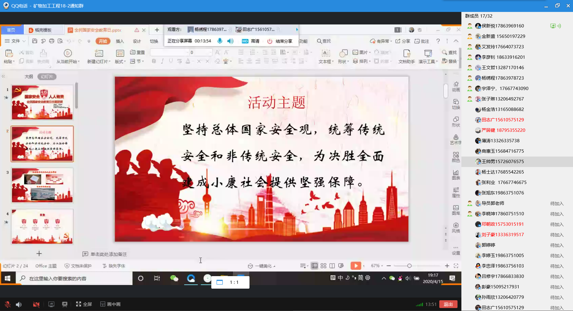结合当前疫情防控形势和学生实际情况,各团支部采取多种线上形式举办主题团日活动。团支部组织全体成员共同观看学习教育部组织录制的2020年全民国家安全教育日高校公共课,通过学习强国平台、学校“两微一端”观看《总体国家安全观公益宣传片》、《总体国家安全观短视频》,学习了解国家安全教育知识,并结合之前参与的大学生安全知识学习答题活动,进一步深化对国家安全的认识和理解。视频学习过后,支部内展开线上讨论,支部成员分享对国家安全观的认识,交流心得,相互促进。有些支部适时开展家庭安全隐患排查工作,支部成员对家中可能存在安全隐患的设施、行为进行排查改正,确保居住环境的安全。