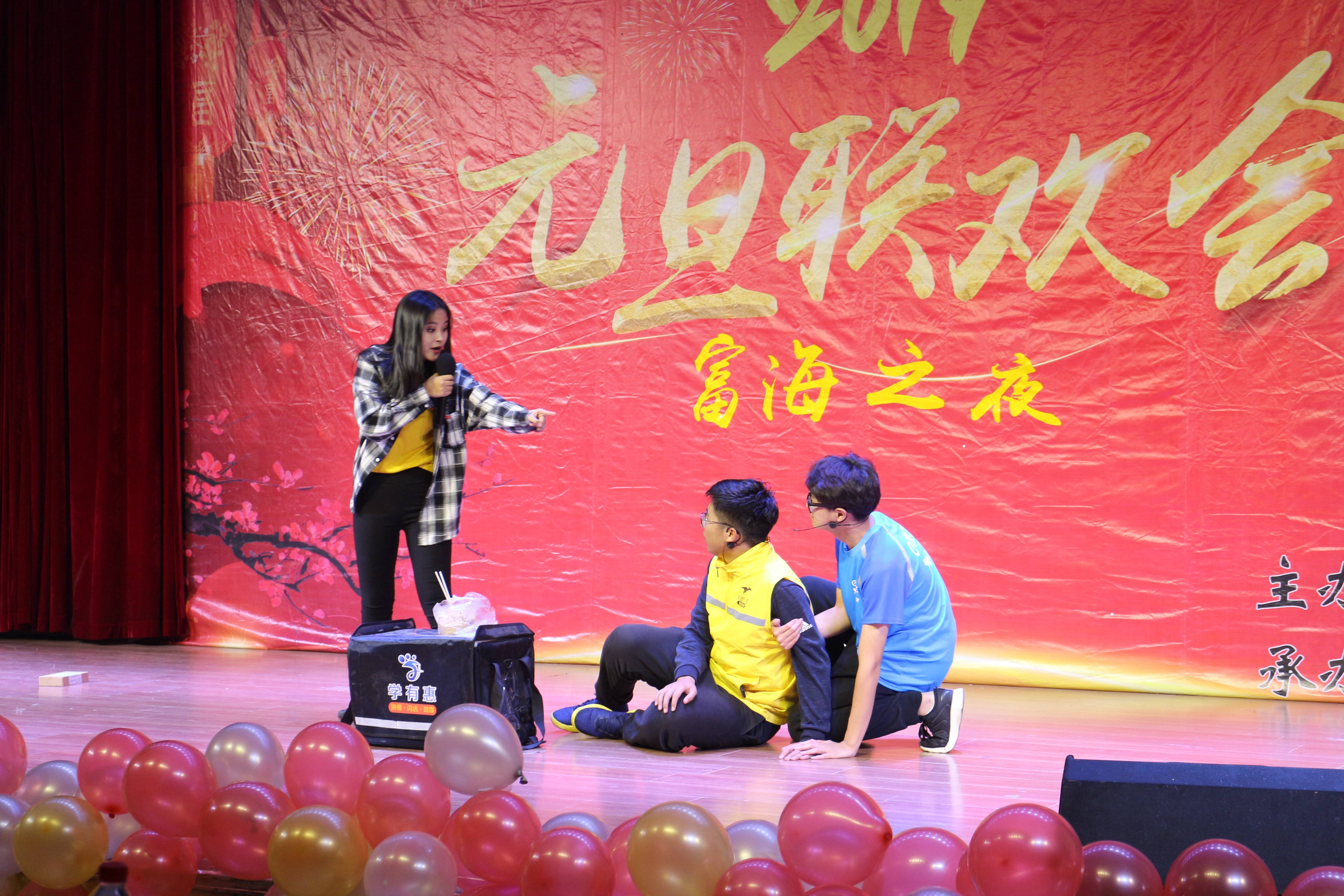 一段热情的开场舞点燃全场,“富海之夜”元旦联欢会就此拉开大幕。悠扬的歌声在舞台响起,歌曲串烧吸引着观众,大家都被歌声感染,现场观众用手机灯光回应场上表演,全场光影摇曳,气氛被烘托起来;而正当意犹未尽之时,小品《当外卖到楼下》的表演引得现场观众阵阵欢笑,同时也让人体会到外卖小哥的艰辛。随后,歌曲《你不是真正的快乐》让师生感受真正的快乐。现场观众已经完全沉浸于欢乐之中。