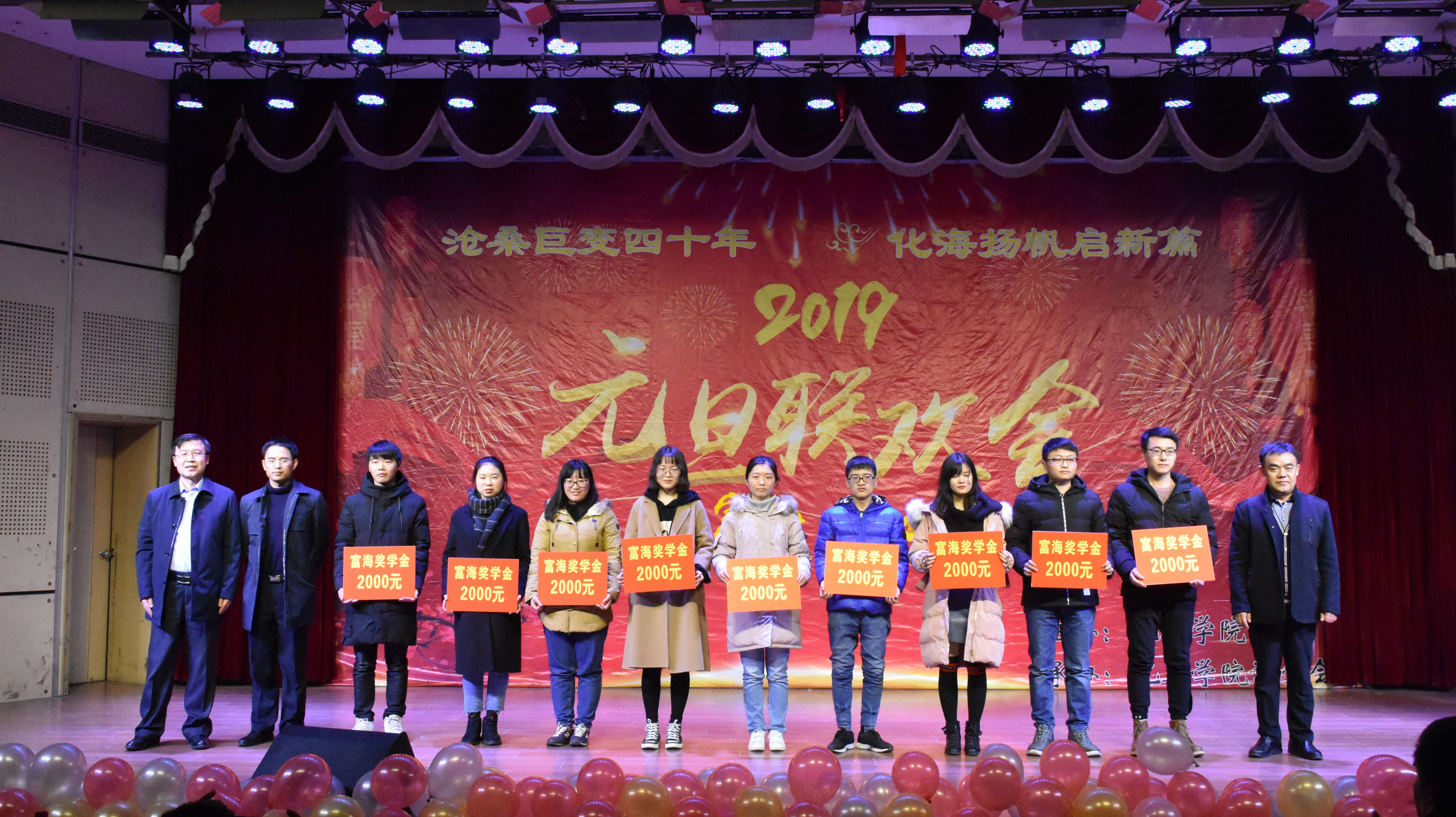 晚会半场时,进行了富海奖学金颁奖仪式。对获得2017-2018学年富海奖学金的20名同学进行了表彰。与会领导嘉宾一一为获奖学生颁奖并合影留念。