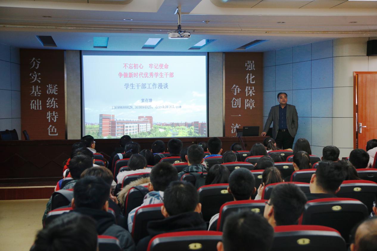 12月25日下午澳门十大信誉好的网站举办第二期17级班干部培训班。此次培训班旨在加强17级新生班干部的工作能力,使班干部能够做好模范带头作用,从而促进良好的班风、学风建设,更好的发挥班级自我管理、自我教育、自我服务职能。