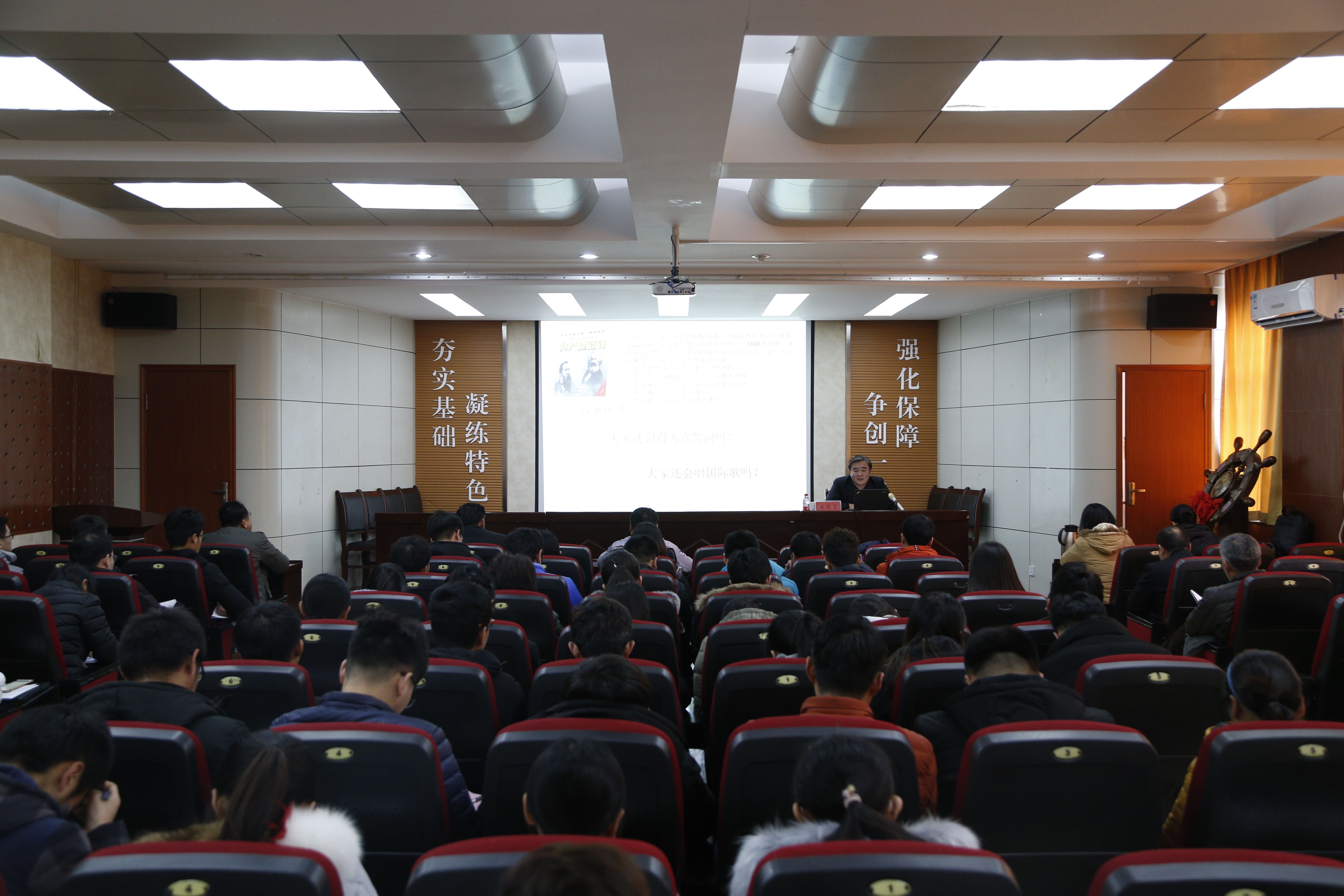 姚校长通过“大家读过《共产党宣言》吗?”、“大家还记得入党誓词吗?”、“大家还会唱国际歌吗?”三个问题开篇,带领大家回顾中国共产党来时的路,引入不忘初心、牢记使命主题,并深刻分析了十九大的里程碑意义。随后,姚校长从“三主·两新·一梦想”的视角,对党的十九大主题、主要成果、社会主要矛盾变化,新时代、新思想,中华民族伟大复兴中国梦进行了系统解读;深刻阐释了习近平新时代中国特色社会主义思想的鲜明特征、科学内涵及历史定位;结合翔实资料总结回顾了十八大以来党和国家事业取得的历史性成就、发生的历史性变革,并专门讲解了教育领域发生的深刻变化;根据十九大报告关于高等教育的部署要求,结合学校实际,深入分析了十大信誉官网发展的目标定位、理念思路等,并号召大家立足现实、着眼未来,立足岗位、奋发有为,努力推进强校建设新征程!