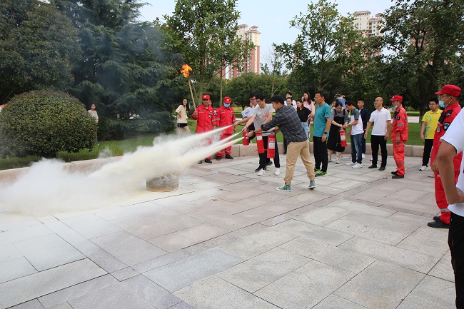 此次培训邀请到安全管理处李灿军、陈浩老师为师生进行讲演。两位老师详细讲解了消防栓开启、水带连接、灭火器使用方法等知识,并现场做了示范。随后,现场模拟了火情发生的场景,师生两人一组,根据风向确定最佳灭火位置,拿起干粉灭火器,上下颠倒几次后拔掉保险销,左手握住喷管,右手提着压把,在距离火焰两米处对准火焰根部进行灭火。大家操作规范,培训效果良好。
