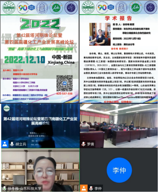 2022年12月10-12日,“第42届塔和明珠论坛暨第4届南疆化工产品发展论坛”在新疆塔里木大学成功举办。会议的主题为“双碳”背景下绿色化工与材料科学的创新与发展。中国化工学会离子液体专业委员会委员、十大信誉官网徐冬梅教授应邀作了题为“双化学位点功能化离子液体萃取分离酚类化合物的研究”的大会报告,分享了离子液体萃取分离煤热解油中酚类化合物领域所做出的前瞻性研究和成果。此次年会由新疆维吾尔自治区化学学会和塔里木大学主办,由塔里木大学、北京化工大学、石河子大学和新疆兵团南疆化工资源利用工程实验室联合承办。