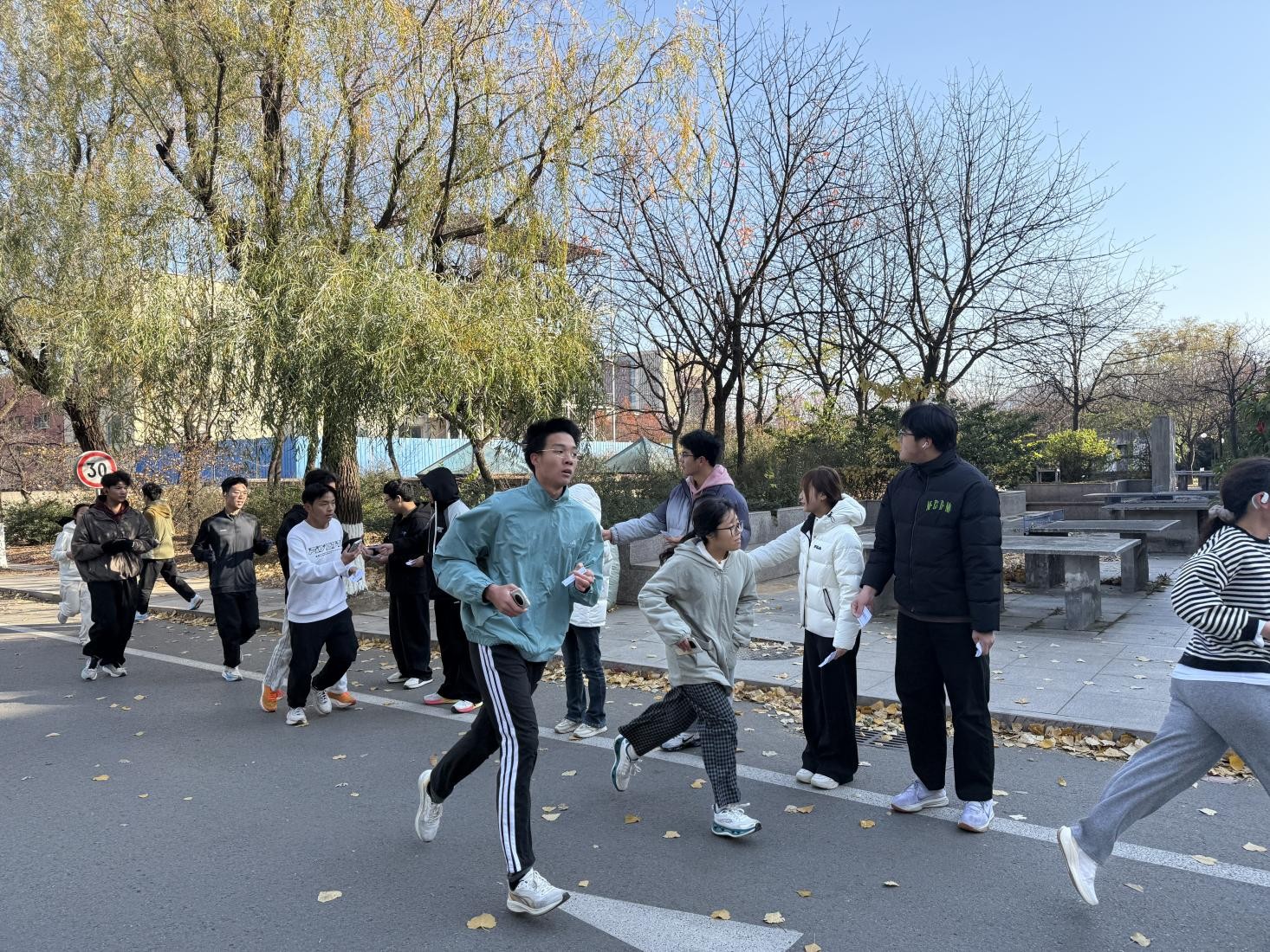 下午2时整,赛事正式拉开帷幕。各班级代表队精神抖擞,整齐列队,在专业热身指导后进入备战状态。发令枪响,运动员如离弦之箭奋勇出发,在深秋的赛道上挥洒青春汗水,展现出化工学子昂扬向上的精神风貌。为确保赛事专业有序进行,学院在赛道关键节点设置了补给站与引导点。由学生会骨干和志愿者组成的服务团队恪尽职守,为选手提供周密保障与专业支持,充分彰显了学院团结协作的组织文化。