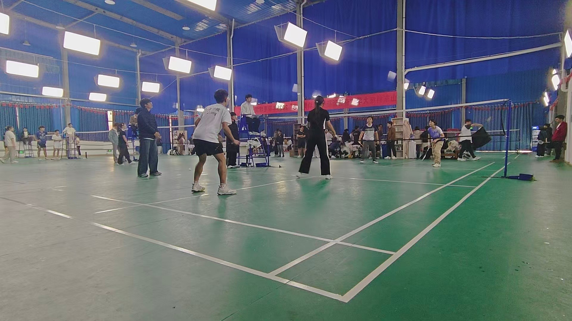 本次比赛设男单、女单、男双、女双和混双五个项目,采用混合团体赛制,全面考验各代表队的整体实力与战术布局。赛场上,化工学子灵活腾挪、奋力挥拍,网前小球细腻精准,后场劈杀势大力沉。每一次精彩的攻防都引来观众阵阵喝彩,场边助威声此起彼伏,现场气氛热烈激昂。