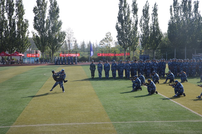 接下来是战术科目展示及擒敌科目展示。“杀——”擒敌拳方阵的同学们在如雷的喊声中涌上训练场。一遍分解招式,他们砍劈有力,进退果断;一遍连贯动作,他们行云流水,拳脚生风。擒敌拳方阵的同学们喊声震天,一招一式尽显刚强。随后入场的特战队队员,全员持枪,熟练运用持枪搜索、警戒卧倒、单兵滚进等战术动作,酣畅淋漓地进行了一次“实战”演练,他们身形矫健、拳脚敏捷,动作灵活迅速,一招一式展示出当代大学生的年轻朝气与阳光风采。他们目光炯炯,眼中尽是青春的果毅和炽热的情怀,尽展军人风采。