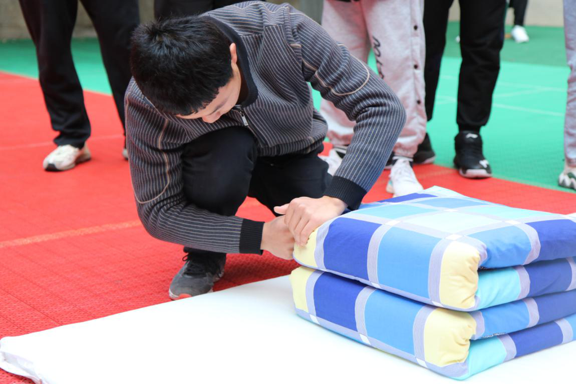 比赛共分为四轮,分别为班级个人叠被、个人蒙眼叠被、男女合作单手叠被、个人完成指定动作叠被。比赛开始前,各班列队整齐,喊出响亮的口号为自己加油助威。参赛人员个个蓄势待发,开始口令一下,选手们立即行动,全神贯注,动作干净利落,手起“被”落间,原本乱作一团的被子变成了一个个方正的豆腐块。现场气氛热闹非凡,场上选手比拼紧张激烈,大赛中的游戏环节则加强了与观众的互动,为比赛增添了欢乐与轻松。由澳门十大信誉好的网站大艺团带来的歌曲和相声表演更是使全场氛围达到了高潮。