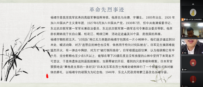 为传承红色精神,缅怀革命先烈,增强大学生的历史责任感和使命感,4月4日,硕研2019学硕团支部开展了“传承红色经典,致敬革命先烈”清明节专题云团日活动。本次活动由团支部书记王世伟主持,支部全体成员在线参与。活动伊始,团支部书记在线分享了几位革命先烈的英勇事迹,让同学们体会到了今天和平盛世的来之不易。随后,大家一同观看专题影片,学习党一百年来波澜壮阔的历史,以在线献花、发表感言的方式致敬先烈。最后,大家就当代大学生如何在日常生活中继承和发扬红色精神这一论题,畅所欲言。活动结束后,同学们纷纷表示,要铭记革命先烈的伟大功绩,珍惜当下来之不易的幸福生活,努力学习,增长才干,做社会主义事业坚定的捍卫者和建设者。