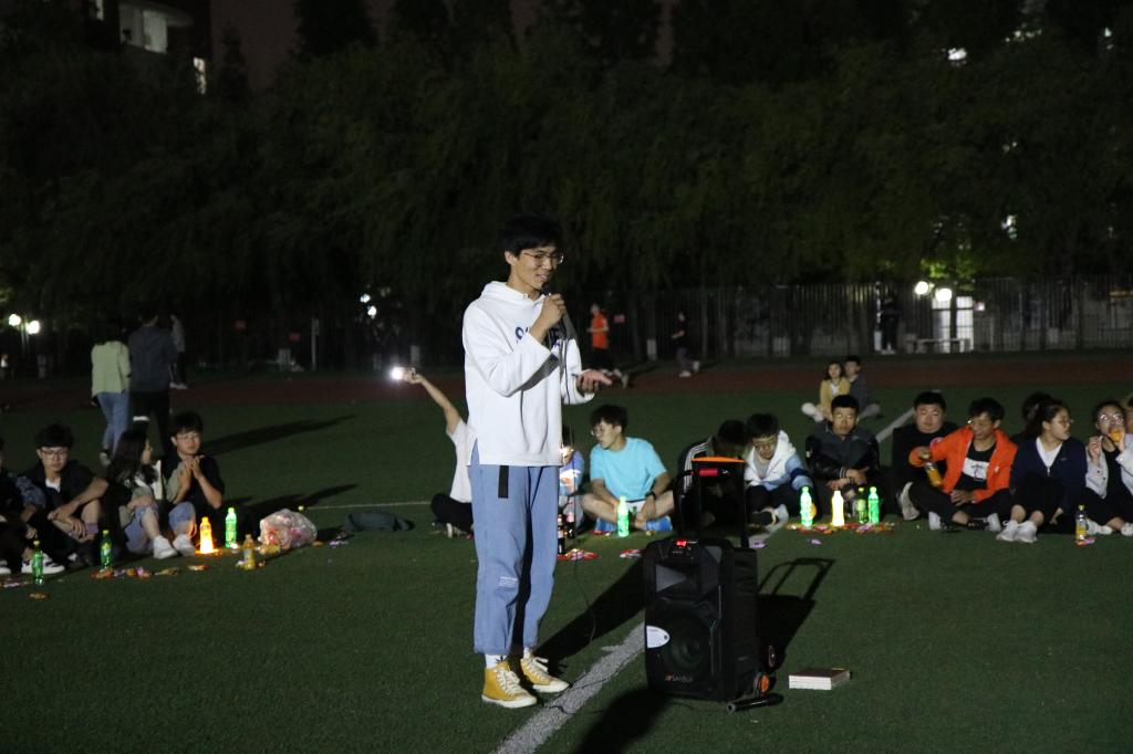 夜幕初起,老师和同学们在谈笑之间围成了一个圈,把圆圈中间作为舞台。19:00,主题团日活动开始,主持人李彦钊首先发表了一段关于本次校运会再获双冠暨甲组十连冠乙组十年九冠的总结,他的讲述激情澎湃,引发同学们回忆起一周前的运动会,激发了大家的真情共鸣。随后,他请出了为运动会提供主力后勤保障服务的澳门十大信誉好的网站学生会体育部,并和在场队员一道,向体育部全体成员喊出自己的感谢:澳门十大信誉好的网站体育部,你们辛苦了!作为答谢,体育部全体成员合唱《多幸运》,感谢相遇,感恩相识,随着渐深的夜色拉开歌会的序幕。
