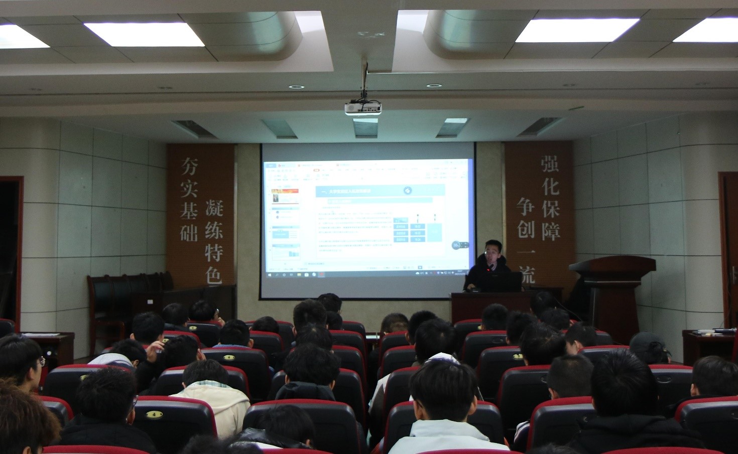 会议伊始,王永海通过介绍军队组成,让同学们对神秘的军营有了初步的了解。接着他讲述了自己的入伍经历以及新兵磨练成老兵的过程,激发同学们内心的热血。他介绍了参军给自己学业生活上带来的益处,如过硬的身体素质、严谨细致的工作作风等,充分调动了大家的积极性。最后,满灏老师就同学们关心的应征入伍的相关规定、退伍大学生复学和考研就业政策等问题进行了解读,并现场对同学们提出问题做出了详细解答。