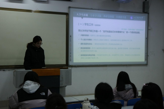 王艺涵在会议上,通过大学生活、专业学习、科研竞赛、自我提升四个方面分享经验。在大学生活不仅是学习知识的过程,更是培养综合能力的重要阶段,积极参与社团活动,提升组织能力和沟通能力;在专业学习上,专业课程是大学生活的核心任务,打好学科基础对未来发展至关重要,注重课堂学习,积极参与课堂讨论,利用线上线下资源学习专业知识;科研竞赛是提升创新能力和实践能力的重要途径,通过科研竞赛提高个人研究能力,为日后打好研究基础;大学生不仅要学好专业知识,还要注重综合素质的提升。