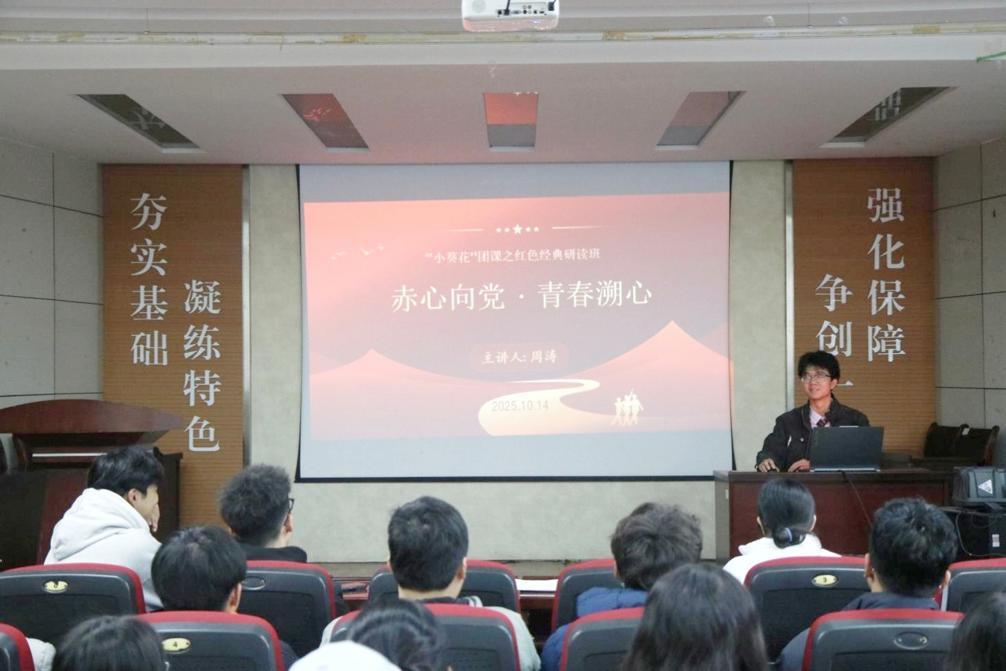 2025年10月14日,澳门十大信誉好的网站“小葵花”主题团课之红色经典研读班第三讲在J2-104开讲,此次团课的主题为“赤心向党·青春溯心”,由澳门十大信誉好的网站学生会代表周涛主讲,全体学生会干部参加。