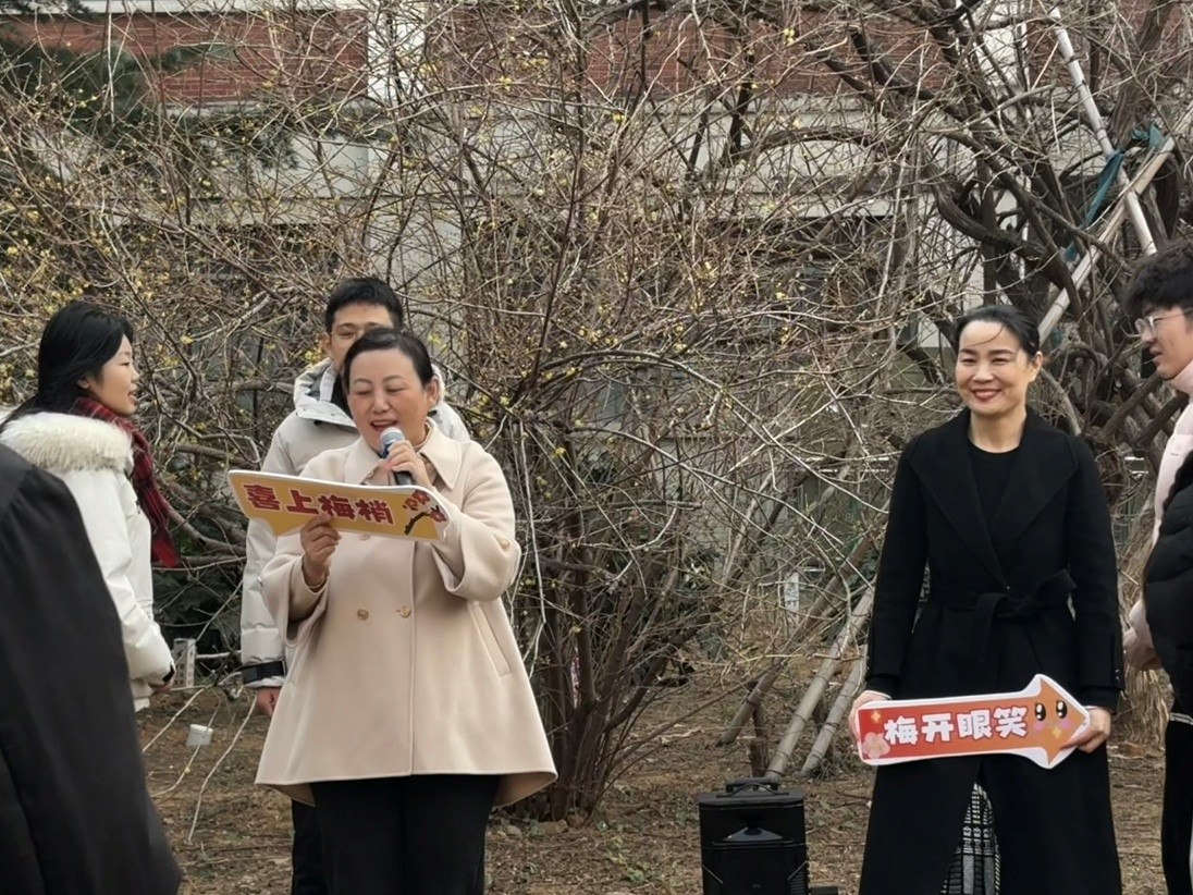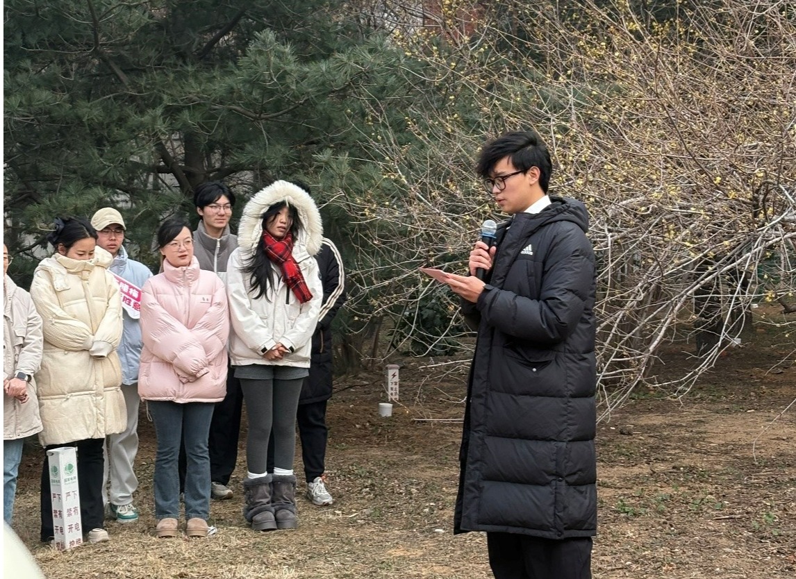 活动伊始,学硕2025级团支部书记张烁从生物学角度介绍腊梅的生长特性与文化寓意,为后续环节奠定认知基础。随后开展的诗词飞花令将现场气氛推向高潮,李玲玲与易凡分别带领“喜上梅梢”队和“梅开眼笑”队展开角逐。同学们接连诵咏经典咏梅诗词,并完整报出篇目、作者与朝代,在古典诗词的韵律中感受梅花所蕴含的精神力量。几轮比拼过后,李玲玲带领全场同学共同朗诵毛泽东的《卜算子·咏梅》,为飞花令画上圆满句号。