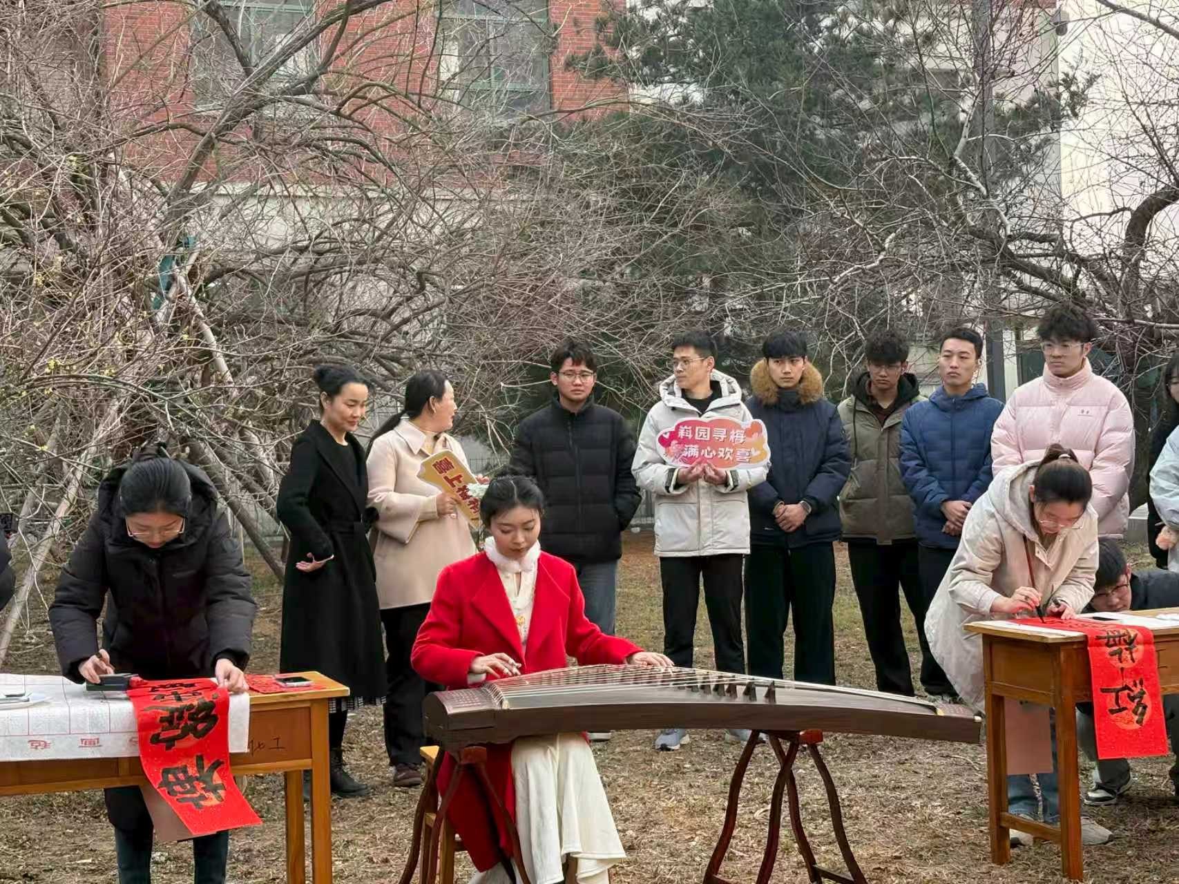 活动现场还融入了多元的艺术展示:古筝演奏者孟一诺指尖流淌出《梅花三弄》的清雅旋律王甜甜、纪玉涵同学在案前挥毫泼墨,书写咏梅对联,琴音与墨香相映成趣;易凡即兴献唱《红梅赞》,为活动增添了浓厚氛围。随后,心健联副会长张益豪从心理学角度阐释如何从腊梅“耐寒”与“不争”的特质中汲取力量,锤炼应对学业压力与人生挫折的心理韧性同学们定格下与腊梅、师友的美好瞬间。