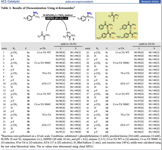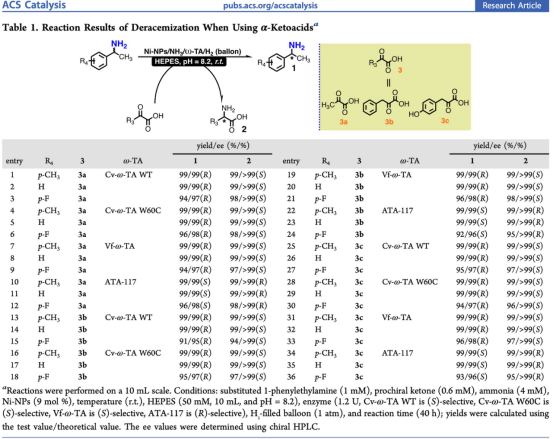 图1. Ni纳米催化剂和ω-转氨酶结合的去消旋化体系(图片来源:ACS Catal.)