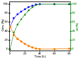 将Ni-NPs催化的还原胺化反应与ω-TA催化的转胺反应结合到一个反应体系中。使用1-苯基乙胺和丙酮酸作为初始底物,Cv-ω-TA-WT作为生物催化剂,初步评估了去消旋化级联体系(图4)。(R)-1-苯基乙胺(蓝色正方形)的产率随着时间的推移逐渐增加,(S)-1-苯基乙基胺(橙色六边形)的产率逐渐降低。通过构型反转,(S)-1-苯基乙胺变为(R)-1-苯基乙基胺,40小时后去消旋化过程完成,(R)-1-苯基乙胺的ee达到99.6%。