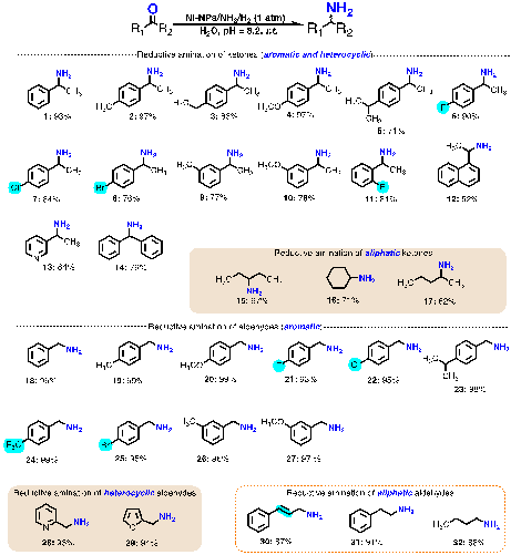 Substrate scope for RA of carbonyl compounds. Conditions: ketone or aldehyde (1 mM), ammonia (4 mM), Ni-NPs (9 mol%) r.t., HEPES (50 mM, 10 mL, and pH = 8.2), H2 filled balloon (1 atm), and reaction time 40 h for ketone and 36 h for aldehyde, yields were determined by HPLC or GC.