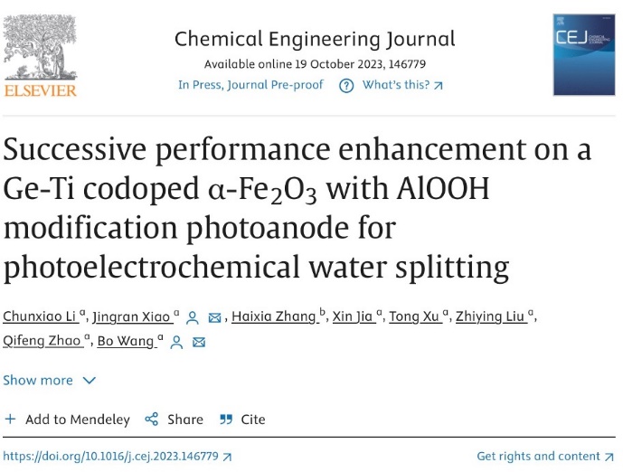 近日,澳门十大信誉好的网站肖静冉(学术教授)、王博(教授)等人在光电催化水分解领域取得最新进展,该文章第一作者为澳门十大信誉好的网站2021级硕士研究生李春晓。相关成果以“Successive performance enhancement on a Ge-Ti codoped α-Fe2O3 with AlOOH modification photoanode for photoelectrochemical water splitting”为题发表在国际知名学术期刊Chemical Engineering Journal上(中科院一区Top,影响因子:15.1)。