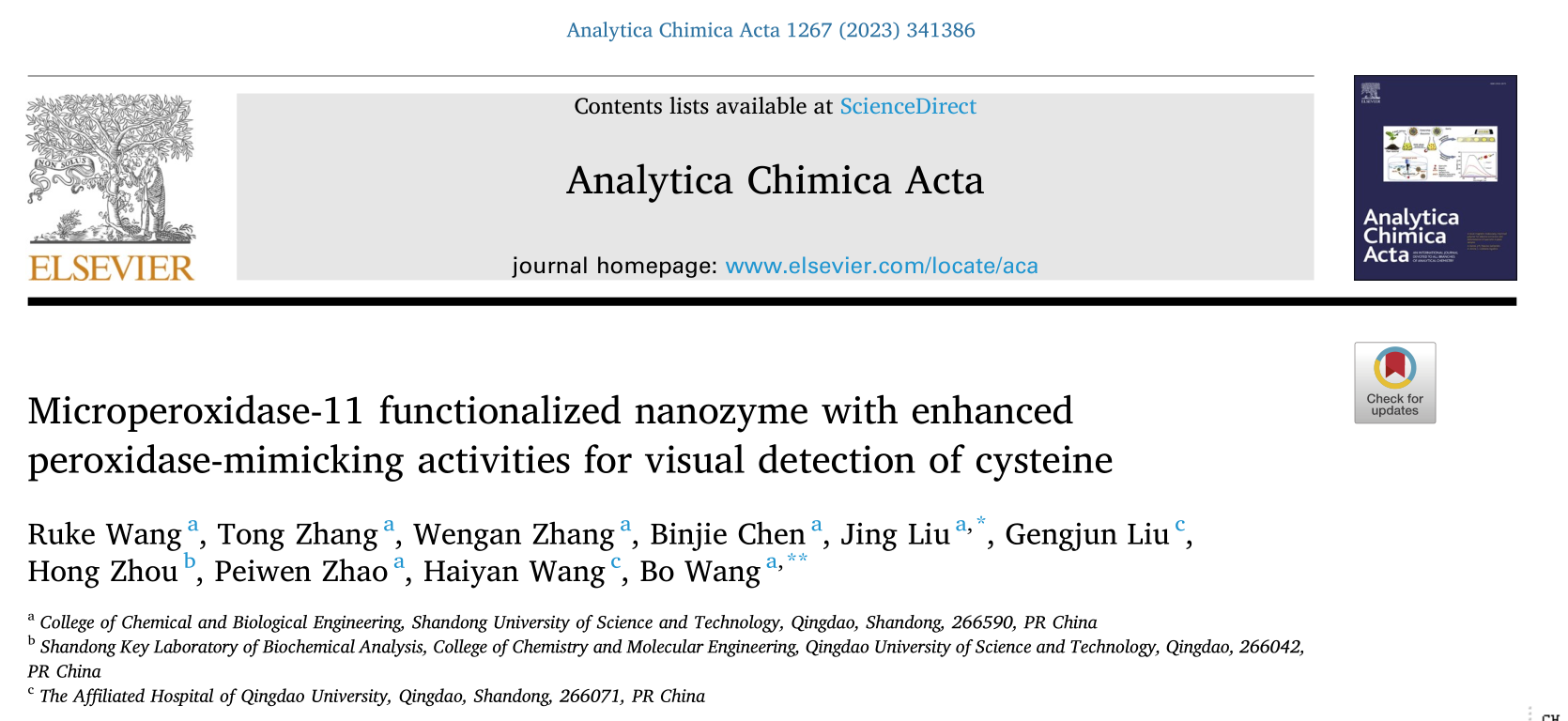 近期,澳门十大信誉好的网站刘静博士(学术副教授)、王博教授等人在生物传感分析领域取得最新进展,相关成果以“Microperoxidase-11 functionalized nanozyme with enhanced peroxidase-mimicking activities for visual detection of cysteine”为题发表在国际学术期刊Analytica Chimica Acta上(中科院一区,影响因子:6.2)。
