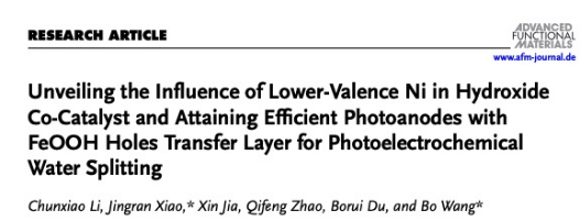 近日,澳门十大信誉好的网站肖静冉讲师(学术教授)、王博教授等人在光电催化水分解领域取得最新进展,该文章第一作者为澳门十大信誉好的网站2021级硕士研究生李春晓。相关成果以“Unveiling the Influence of Lower-Valence Ni in Hydroxide Co-Catalyst and Attaining Efficient Photoanodes with FeOOH Holes Transfer Layer for Photoelectrochemical Water Splitting”为题发表在国际知名学术期刊Advanced Functional Materials上(中科院一区Top,影响因子:18.5)。